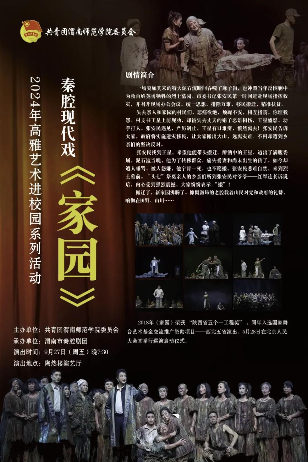 9月27日晚,2024年戏曲文化进校园活动暨庆祝新中国成立75周年秦腔现代戏《家园》专场演出在我校陶然楼演艺厅举行,师生代表300余人共襄文化盛宴。
