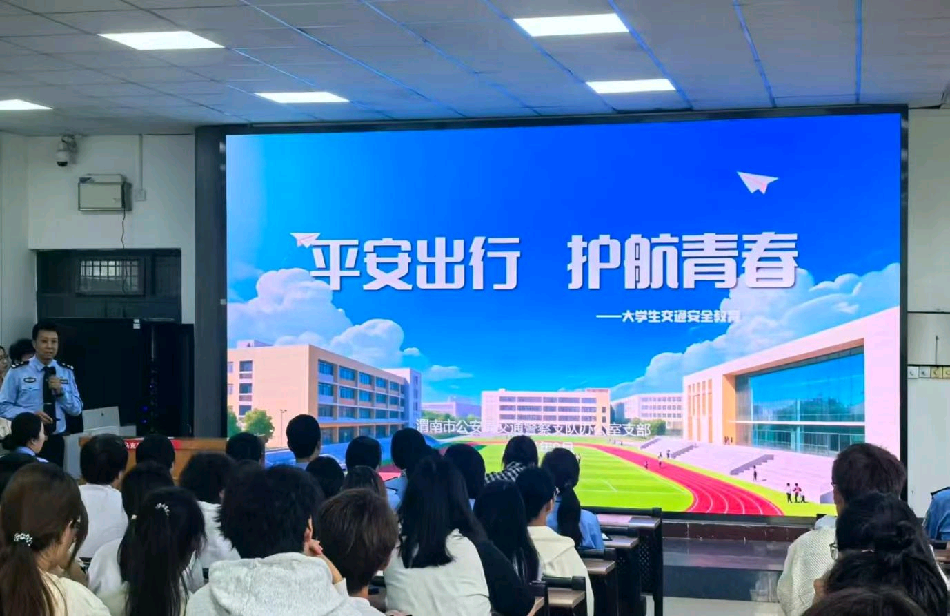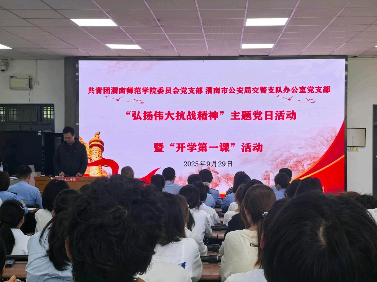 9月29日下午,我校团委联合渭南市公安局交警支队办公室在博识楼1101举办“弘扬伟大抗战精神”党支部共建主题党日活动暨交通安全进校园“开学第一课”活动。活动由校团委副书记潘涛主持。