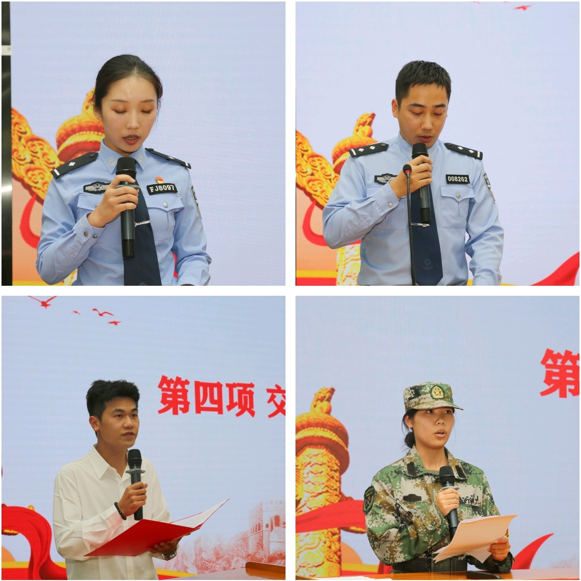 交流发言环节,渭南市公安局交警支队的党政辉和杨子悦警官结合工作实际,传递责任担当;我校学生代表红旗宣讲团马康同学和国旗护卫队刘紫涵同学立足青年视角,诉说传承伟大抗战精神的决心。
