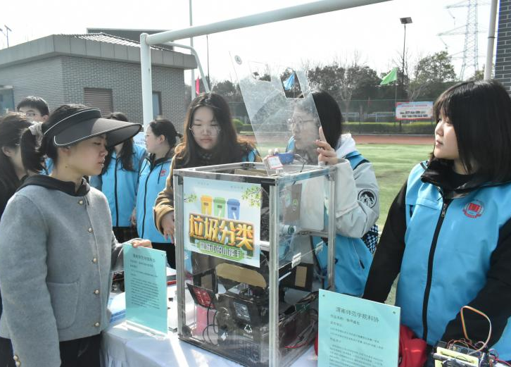现场展出了水陆两栖垃圾回收车、智能激光对抗小车、水下管道巡检无人艇、韭菜切割收集车等获奖成果,涵盖生态环保、智能巡检、农业自动化等领域,均为近年国家级、省级学科竞赛获奖作品。社团成员为到场嘉宾与市民讲解作品设计思路与应用场景,同步开展趣味科学实验互动,传递科创理念。
