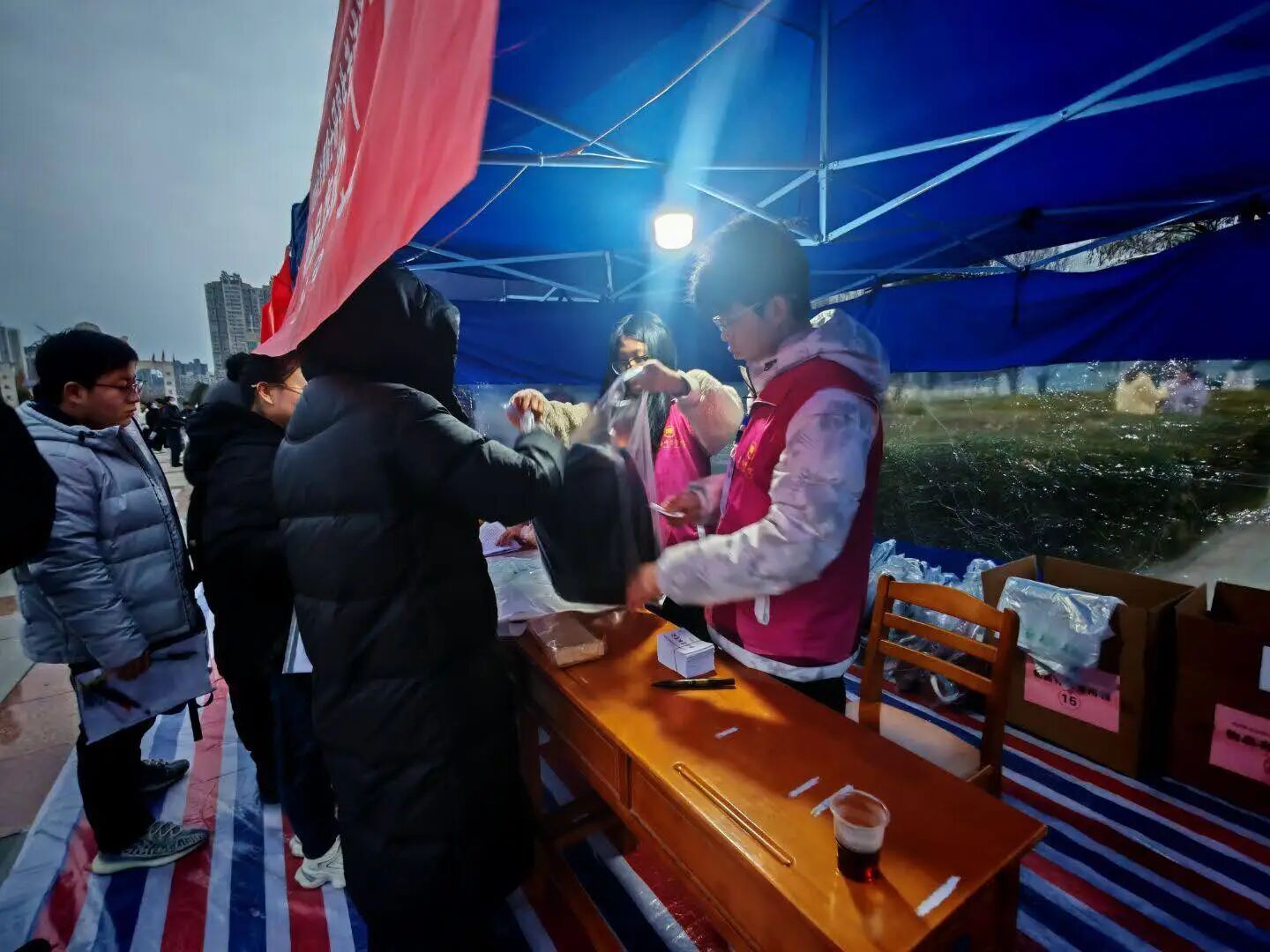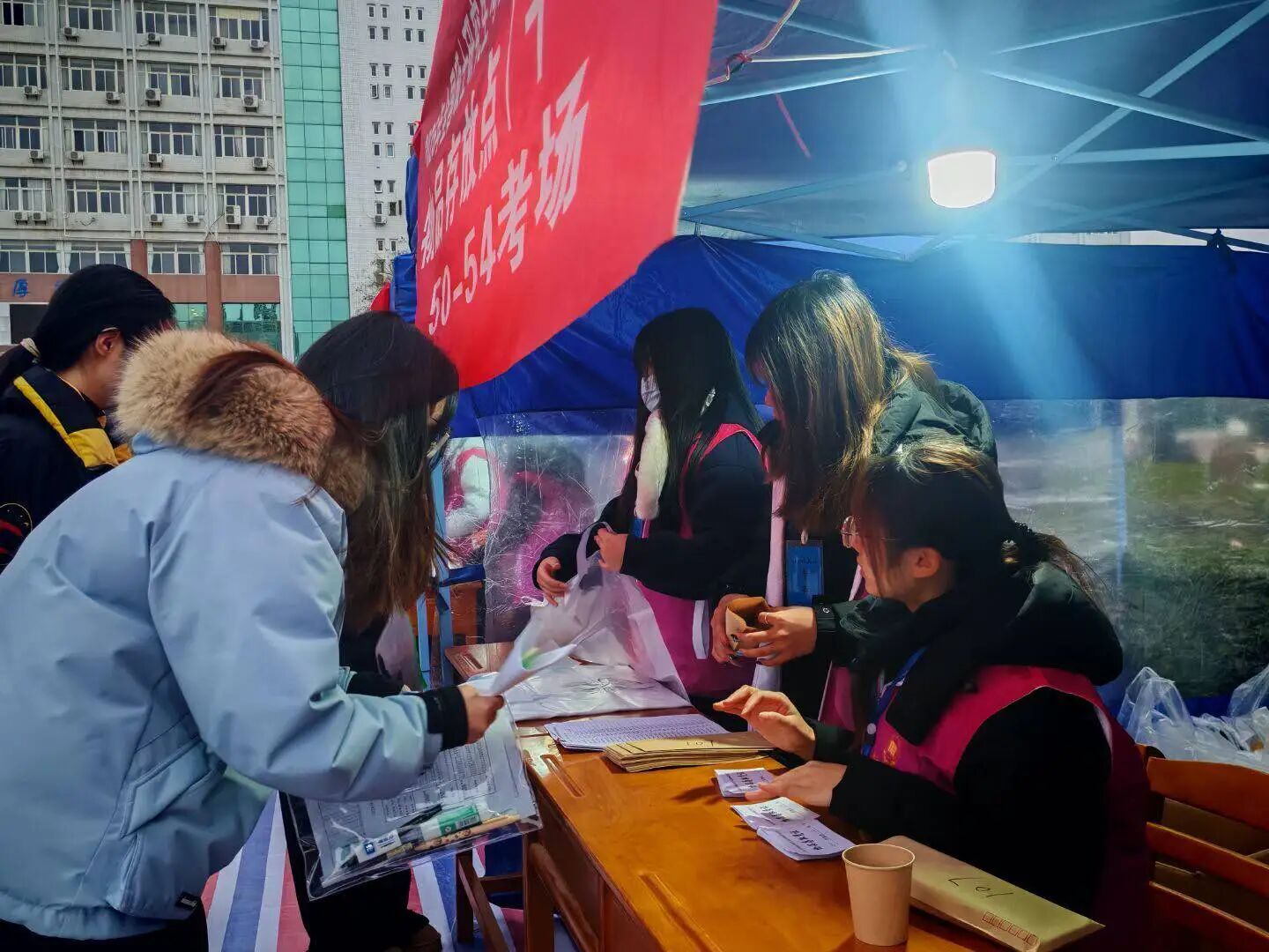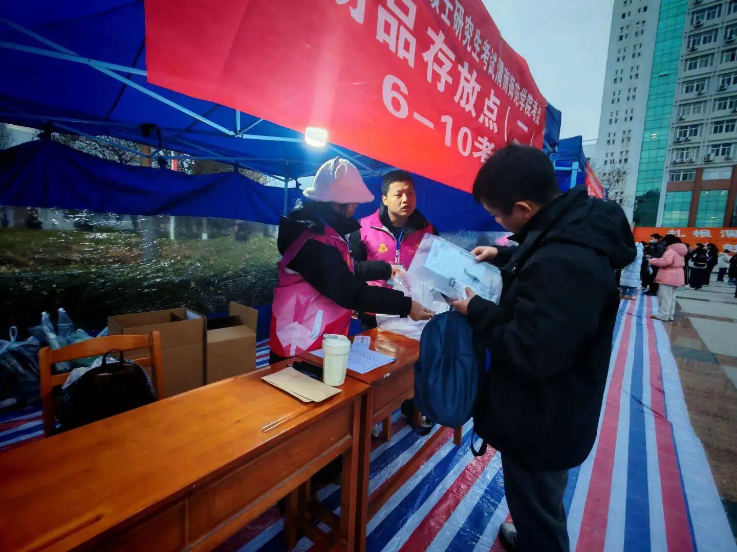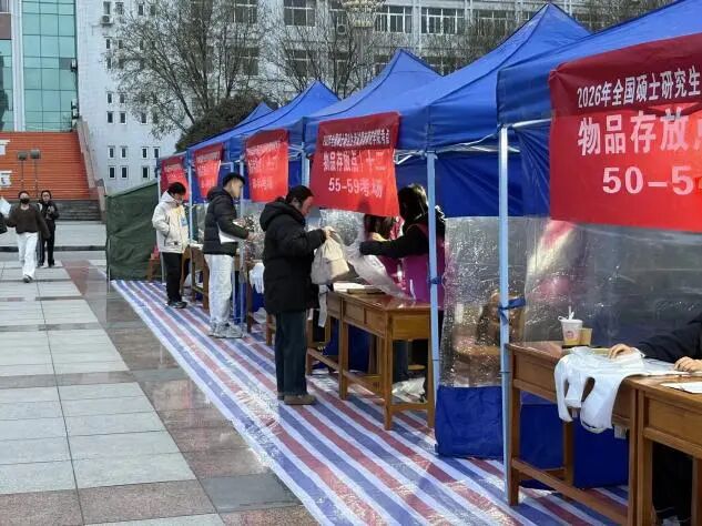 考研服务当天,志愿者们准时抵达指定服务点位,大家分工协作,仔细检查各类标识与服务设施。为让考生感受到冬日里的温暖,志愿者将指引牌放置在醒目位置,反复核对服务流程细节。学校为志愿者准备热水,暖贴等物资,为志愿者送上冬日里的温暖关怀。寒风凛冽,志愿者以饱满的精神状态静待考生们到来,用行动诠释着“志愿先行”的责任与担当。
