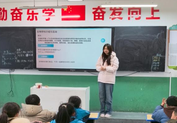 生科252班周沂纳同学于汉中市洋县城北小学开展生物科普微课实践。以生活化生命现象为切入点,借助生动案例为小学生讲解科学知识,激发青少年对生命科学的探索兴趣。将专业知识转化为科普资源,在实践中锤炼教学设计与语言表达能力,以扎实行动助力青少年科学素养提升。